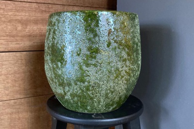 Bloempot HS Groen Aardewerk. Hoog 21 cm en doorsnede 24 cm.